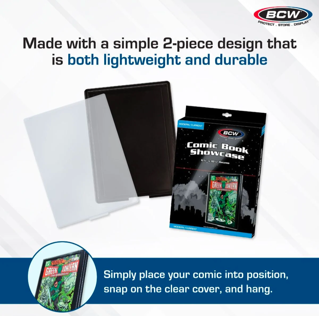 The BCW Comic Book Showcase Holder is made of high quality, crystal clear polystyrene and a strong black polystyrene back. Features a 2 piece frame design, with a wall mountable back. The BCW Comic Book Showcase Holder's simple setup ensures a hassle-free display, letting your current comics shine while also keeping them well protected.